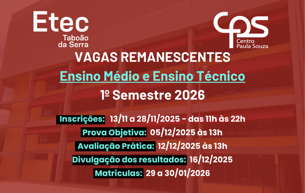 A Escola Técnica Estadual de Taboão da Serra, atendendo o disposto no § 3.º do Artigo 72 do Regimento Comum das Escolas Técnicas Estaduais do Centro Estadual de Educação Tecnológica Paula Souza, torna pública a abertura de inscrições para o Processo Especial de Seleção de Candidatos para o preenchimento de Vagas Remanescentes da Segunda e Terceira Série do Ensino Médio com Habilitação Profissional de Técnico em Desenvolvimento deSistemas (Mtec-PI), Segunda Série do Ensino Médio com Habilitação Profissional de Técnico em Informática (Mtec-N), Segunda e Terceira Série do Ensino Médio com Habilitação Profissional de Técnico em Informática paraInternet (Mtec-N) e Segundo Módulo do Curso Técnico em Informática (com 20% online) com o ingresso no 1º semestre de 2026: